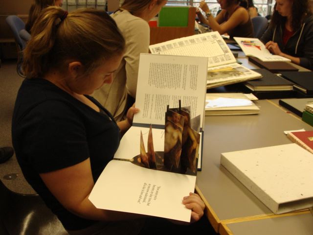 One nice thing about the Block Plan is that it makes field trips easy—students can take a whole day or more for trips and not worry about missing any other classes. Our book class went to Denver for a day, to visit Special Collections at the Penrose Library at the University of Denver, and the Abecedarian Gallery, which is in the Santa Fe Arts District in Denver. Abecedarian is one of the few galleries in the country that regularly shows artists’ books. It’s nice to have it so close & so accessible.